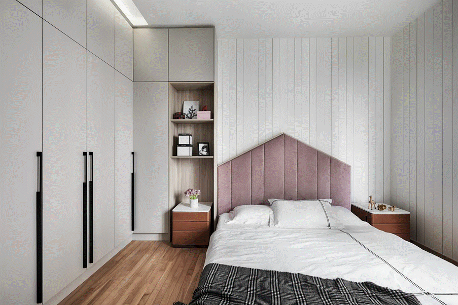 Delicate and composed, the daughter’s room offers a serene escape. A blush-toned headboard creates a gentle architectural statement, while soft finishes and clean lines bring clarity and calm. Built-in storage ensures the space remains neat and nurturing, ideal for both rest and quiet inspiration.