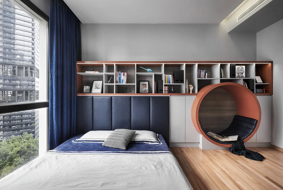 In contrast, the son’s room channels energy and imagination. Anchored in deep blue tones, the design features a full-length bookshelf that combines function with flair. A circular reading nook adds a whimsical touch—perfect for downtime or discovery.