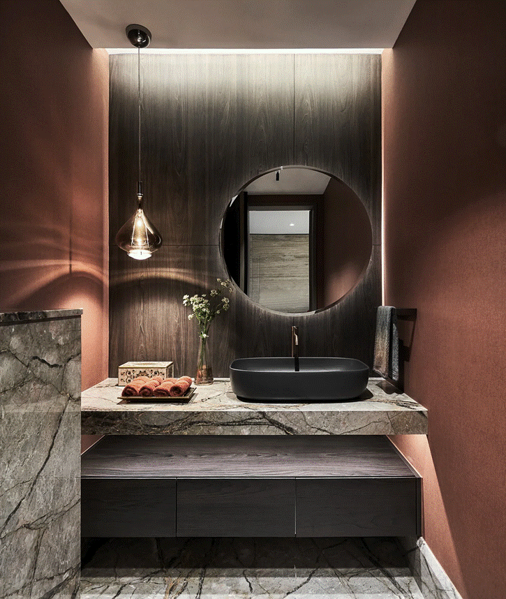 Throughout the Ardmore Park residence, CD’s design philosophy shines—timeless elegance paired with thoughtful practicality and moments of visual surprise. Every element, from spatial planning to discreet storage, is carefully considered to create a home that is refined and effortlessly liveable. Nowhere is this more evident than in the powder room.
